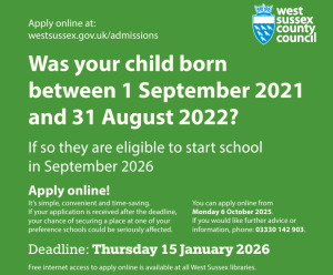 All parents applying for a place, should complete the Local Authority Application Form, which requires parents to state three schools in order of preference. This form should be completed online at www.westsussex.gov.uk between 9.00am on Monday 6th October 2025 until 11.59pm on Thursday 15th January 2026.